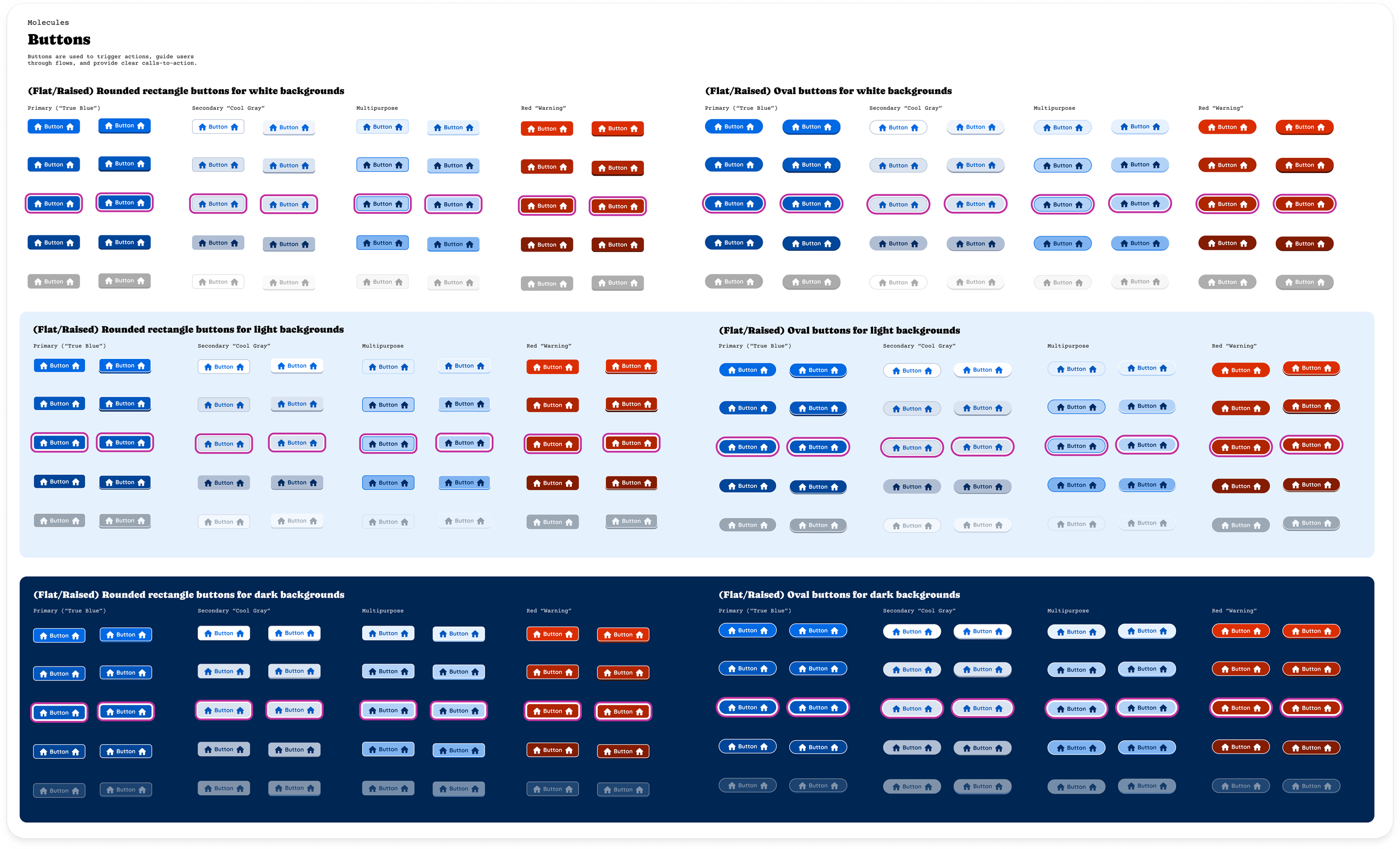 I worked with the tech lead to design button variations based on two primary factors: the intended grade band of the end user (which impacted sizing and style) and the background color behind the button (white, light, or dark). We also included variants for default, hover, active, and disabled states.