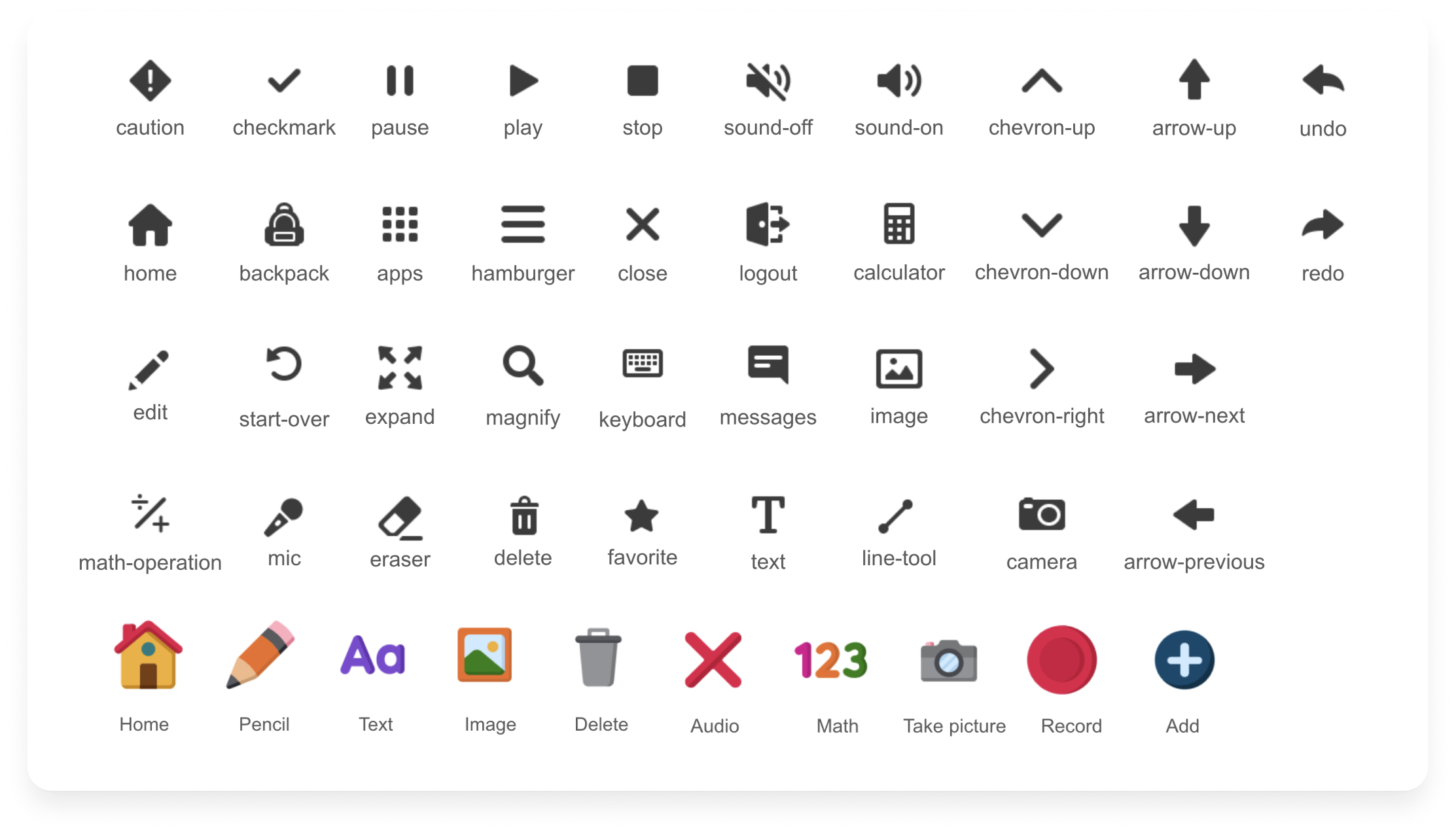 Since K-1 students are still learning how to use technology, they interact with digital tools using the schema as they do with real-world objects. To support our youngest learners as they make sense of our digital tools, we have illustrated icons that resemble real-world objects. Not all icons will have an illustrated version, but rather those that are “used as a metaphor” (ex. Home)